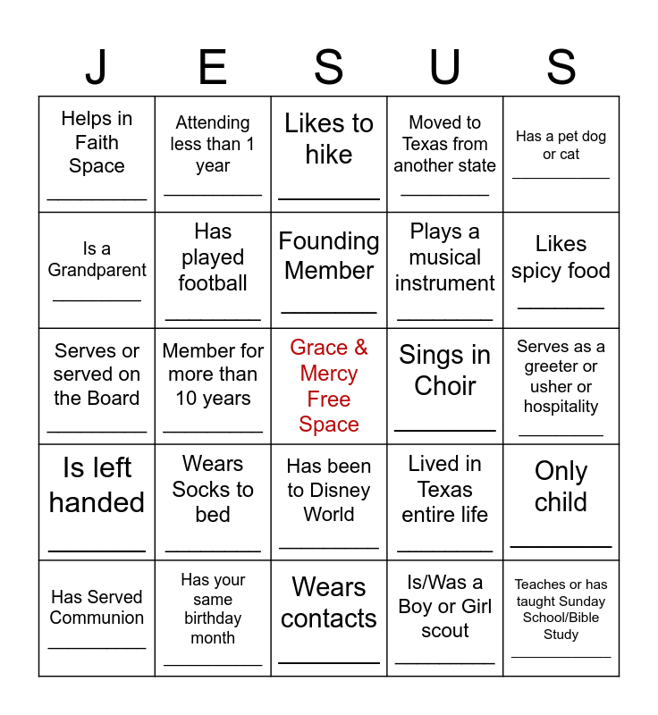 This bingo card has a free space and 24 words: Has Served Communion __________, Wears Socks to bed ________, Founding Member _______, Is/Was a Boy or Girl scout _________, Has a pet dog or cat ____________, Helps in Faith Space _________, Attending less than 1 year __________, Likes to hike _______, Sings in Choir _______, Serves as a greeter or usher or hospitality _________, Serves or served on the Board _________, Has played football ________, Lived in Texas entire life ________, Only child _______, Is a Grandparent _________, Has your same birthday month ___________, Wears contacts _______, Moved to Texas from another state _________, Likes spicy food _______, Is left handed ______, Member for more than 10 years _________, Has been to Disney World _________, Plays a musical instrument ________ and Teaches or has taught Sunday School/Bible Study _____________.
