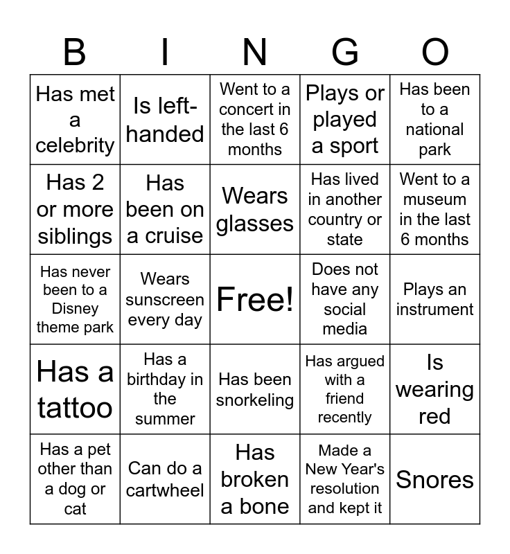 This bingo card has a free space and 24 words: Has a birthday in the summer, Can do a cartwheel, Wears glasses, Has a pet other than a dog or cat, Has been to a national park, Has met a celebrity, Has 2 or more siblings, Is left-handed, Does not have any social media, Has been snorkeling, Has lived in another country or state, Has never been to a Disney theme park, Has argued with a friend recently, Is wearing red, Has been on a cruise, Made a New Year's resolution and kept it, Plays an instrument, Went to a concert in the last 6 months, Went to a museum in the last 6 months, Wears sunscreen every day, Snores, Has a tattoo, Plays or played a sport and Has broken a bone.