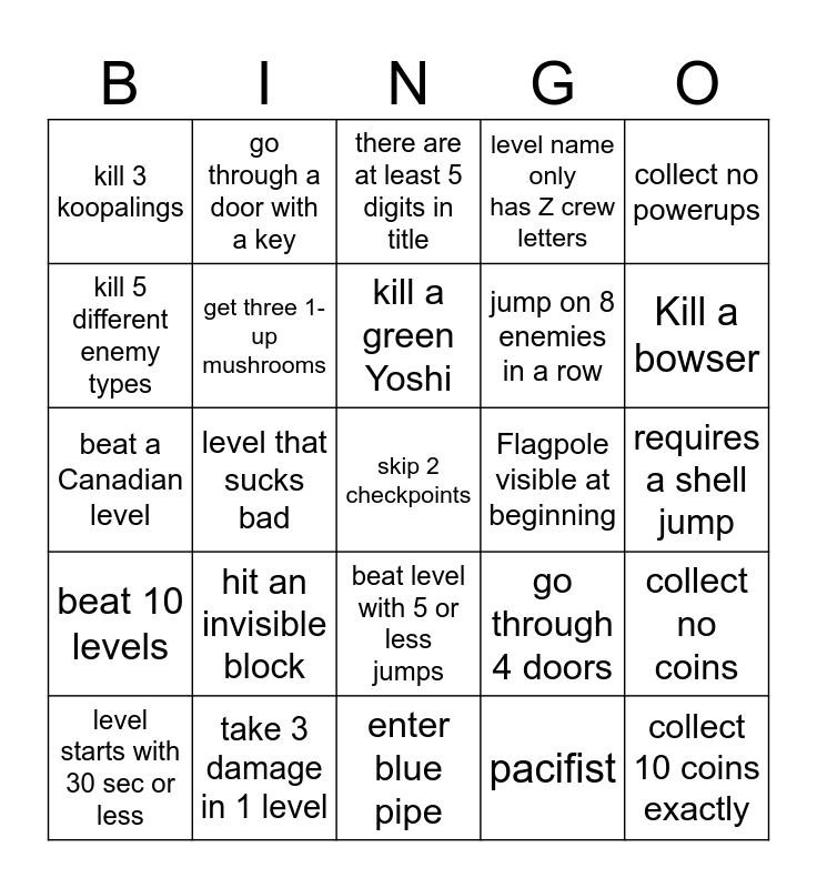 This bingo card has 36 words: confetti visual effects, made by a german, only move right, get three 1-up mushrooms, go through 4 doors, beat 10 levels, kill a green Yoshi, Survive a poison mushroom, collect no powerups, level name only has A-crew letters, level that sucks bad, level name only has Z crew letters, Typo in title, Flagpole visible at beginning, Kill a bowser, kill 3 koopalings, collect 10 coins exactly, hit an invisible block, skip 2 checkpoints, there are at least 5 digits in title, requires a shell jump, collect no coins, take 3 damage in 1 level, level starts with 30 sec or less, enter blue pipe, go through a door with a key, beat a Canadian level, go through 4 pipes, jump on 8 enemies in a row, kill 5 different enemy types, ride a red Yoshi, stomp 10 turts. perchance, pacifist, beat level with 5 or less jumps, beat first try and "no land after jump" cleat condition.