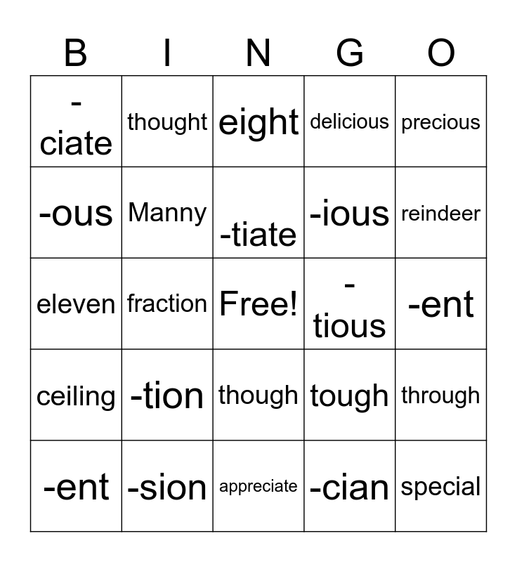 This bingo card has a free space and 24 words: -tion, -sion, -tiate, -ent, precious, -ciate, -ous, thought, -tious, though, -ious, eleven, tough, through, Manny, -cian, -ent, eight, reindeer, fraction, special, ceiling, delicious and appreciate.