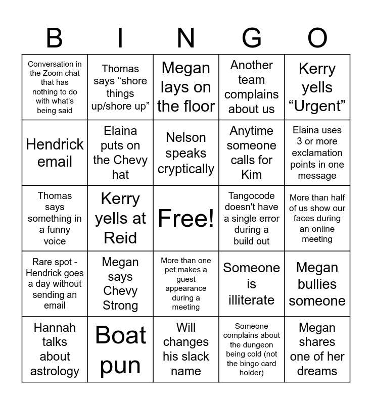 This bingo card has a free space and 37 words: Thomas holds his stress bat, Thomas flails his arms around in a meeting, A "gosh golly/golly gosh" from Nelson, Elaina puts on the Chevy hat, Megan bullies someone, Megan says Chevy Strong, Nelson speaks cryptically, Urgent PPC email, Kerry yells “Urgent”, Kerry yells “Is it live?!”, Kerry yells at Reid, Another team complains about us, Megan shares one of her dreams, More than half of us show our faces during an online meeting, Hendrick email, Rare spot - Hendrick goes a day without sending an email, Thomas asks an ice breaker question, Megan lays on the floor, More than one pet makes a guest appearance during a meeting, Tangocode doesn't have a single error during a build out, Conversation in the Zoom chat that has nothing to do with what’s being said, Elaina uses 3 or more exclamation points in one message, Hannah talks about astrology, Will changes his slack name, Jasmine creates a Notion page, Someone complains about the dungeon being cold (not the bingo card holder), Thomas says “shore things up/shore up”, Someone types in ALL CAPS in a PPC channel, Will changes his slack picture, “Several people are typing” in a PPC channel, Someone sits in a chair Sonya has sat in (because it’s so low), Boat pun, Thomas says something in a funny voice, Niamh says “hot take”, Someone is illiterate, Anytime someone calls for Kim and Kailyn walks in with Starbucks.
