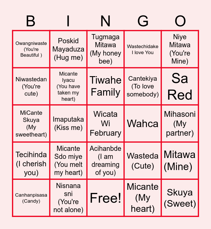 This bingo card has 25 words: Tecihinda (I cherish you), Nisnana sni (You're not alone), Wicata Wi February, Micante (My heart), Niye Mitawa (You're Mine), Owangniwaste (You're Beautiful ), Poskid Mayaduza (Hug me), Tugmaga Mitawa (My honey bee), Wahca, Mitawa (Mine), Niwastedan (You're cute), Micante Iyacu (You have taken my heart), Free!, Wasteda (Cute), Sa Red, Canhanpisasa (Candy), Imaputaka (Kiss me), Tiwahe Family, Cantekiya (To love somebody), Mihasoni (My partner), MiCante Skuya (My sweetheart), Micante Sdo miye (You melt my heart), Acihanbde (I am dreaming of you), Wastechidake I love You and Skuya (Sweet).