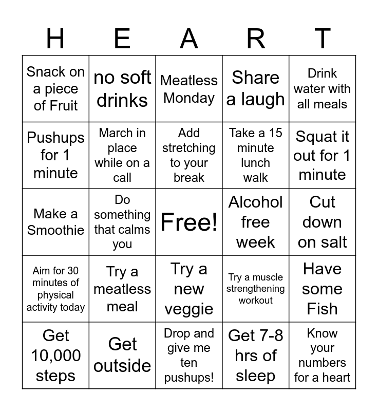 This bingo card has a free space and 24 words: Try a meatless meal, Get outside, Add stretching to your break, Get 10,000 steps, Drink water with all meals, Snack on a piece of Fruit, Pushups for 1 minute, no soft drinks, Alcohol free week, Try a new veggie, Take a 15 minute lunch walk, Make a Smoothie, Try a muscle strengthening workout, Have some Fish, March in place while on a call, Get 7-8 hrs of sleep, Cut down on salt, Meatless Monday, Squat it out for 1 minute, Do something that calms you, Know your numbers for a heart, Aim for 30 minutes of physical activity today, Share a laugh and Drop and give me ten pushups!.