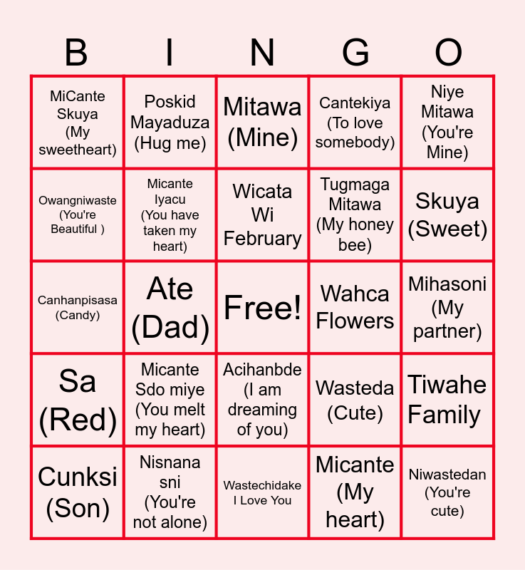 This bingo card has a free space and 27 words: Tecihinda (I cherish you), Nisnana sni (You're not alone), Wicata Wi February, Micante (My heart), Niye Mitawa (You're Mine), Owangniwaste (You're Beautiful ), Poskid Mayaduza (Hug me), Wastechidake I Love You, Wahca Flowers, Tiwahe Family, Sa (Red), Micante Iyacu (You have taken my heart), Wasteda (Cute), Niwastedan (You're cute), Canhanpisasa (Candy), Imaputaka (Kiss me), Mitawa (Mine), Cantekiya (To love somebody), Mihasoni (My partner), MiCante Skuya (My sweetheart), Micante Sdo miye (You melt my heart), Acihanbde (I am dreaming of you), Tugmaga Mitawa (My honey bee), Skuya (Sweet), Cunksi (Son), Ate (Dad) and Ina Mom.