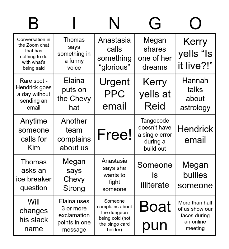 This bingo card has a free space and 38 words: Anastasia on a Wednesday with a cane, Thomas holds his stress bat, Thomas flails his arms around in a meeting, Elaina puts on the Chevy hat, Megan bullies someone, Megan says Chevy Strong, Urgent PPC email, Kerry yells “Urgent”, Kerry yells “Is it live?!”, Kerry yells at Reid, Another team complains about us, Megan shares one of her dreams, More than half of us show our faces during an online meeting, Hendrick email, Rare spot - Hendrick goes a day without sending an email, Thomas asks an ice breaker question, Megan lays on the floor, Anastasia calls something “glorious”, More than one pet makes a guest appearance during a meeting, Tangocode doesn't have a single error during a build out, Conversation in the Zoom chat that has nothing to do with what’s being said, Elaina uses 3 or more exclamation points in one message, Hannah talks about astrology, Will changes his slack name, Jasmine creates a Notion page, Someone complains about the dungeon being cold (not the bingo card holder), Thomas says “shore things up/shore up”, Someone types in ALL CAPS in a PPC channel, Will changes his slack picture, “Several people are typing” in a PPC channel, Someone sits in a chair Sonya has sat in (because it’s so low), Anastasia says she wants to fight someone, Boat pun, Thomas says something in a funny voice, Niamh says “hot take”, Someone is illiterate, Anytime someone calls for Kim and Kailyn walks in with Starbucks.