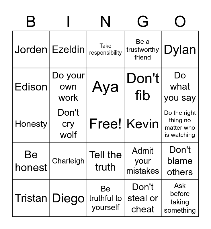 This bingo card has a free space and 24 words: Charleigh, Diego, Aya, Tristan, Dylan, Jorden, Edison, Ezeldin, Kevin, Tell the truth, Don't fib, Honesty, Admit your mistakes, Don't blame others, Do your own work, Don't steal or cheat, Do the right thing no matter who is watching, Take responsibility, Do what you say, Don't cry wolf, Ask before taking something, Be honest, Be a trustworthy friend and Be truthful to yourself.