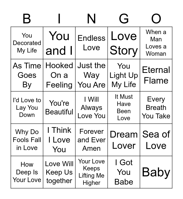 This bingo card has 45 words: Total Eclipse of the Heart, I Will Always Love You, My Girl, How Deep Is Your Love, Crazy Little Thing Called Love, I Got You Babe, Endless Love, You're Still the One, When a Man Loves a Woman, Love Will Keep Us together, Love Story, It Must Have Been Love, Forever and Ever Amen, I Think I Love You, Sugar, Sugar, Your Love Keeps Lifting Me Higher, Can't Help Falling in Love, I'd Love to Lay You Down, Best of My Love, Eternal Flame, You and I, Just the Way You Are, Make you Feel My Love, You Decorated My Life, I Don't Want to be Right, Every Breath You Take, The Power of Love, Put Your Head on My Shoulder, Dream Lover, Why Do Fools Fall in Love, Blueberry Hill, Sea of Love, Eight Days a Week, Crazy, This Magic Moment, You're Beautiful, Everything, Thinking Out Loud, Baby, Just the Way You Are, As Time Goes By, You Light Up My Life, We've Only Just Begun, Hooked On a Feeling and Your My Best Friend.