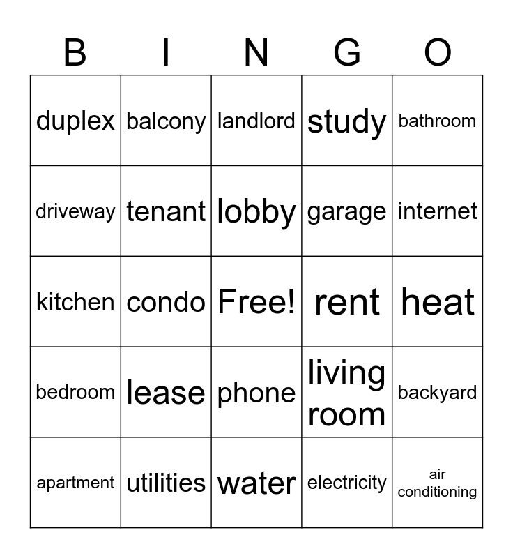 This bingo card has a free space and 29 words: apartment, house, condo, town house, duplex, landlord, tenant, lease, rent, utilities, heat, air conditioning, water, electricity, internet, cable TV, phone, bedroom, bathroom, kitchen, living room, dining room, garage, driveway, study, balcony, backyard, lobby and bachelor apartment.