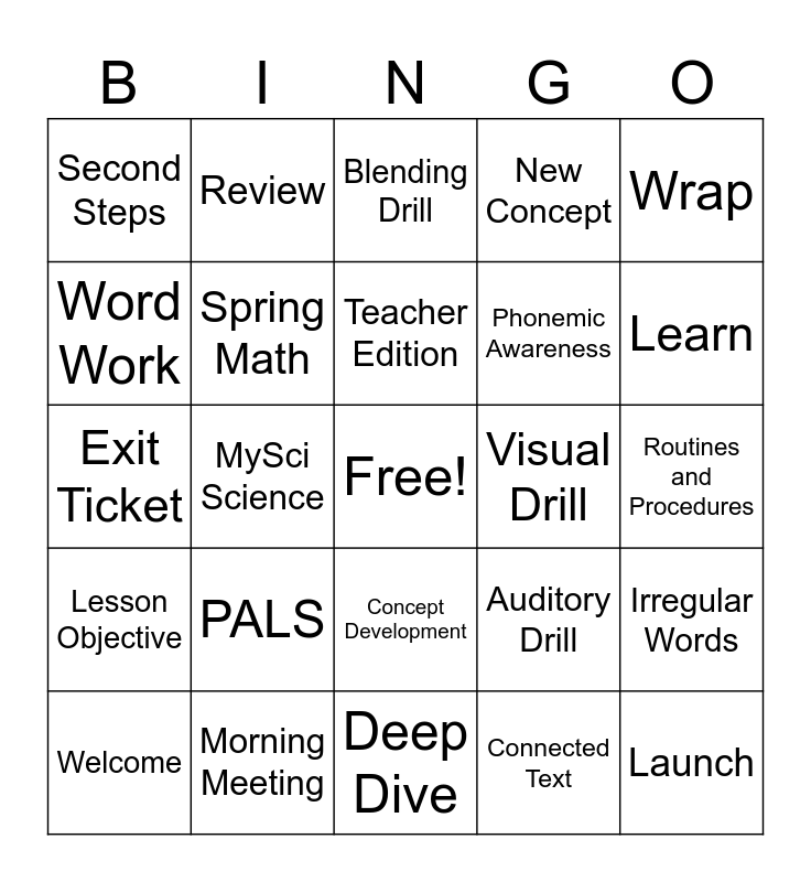 This bingo card has a free space and 29 words: Welcome, Application Problem, MySci Science, Social Studies Weekly, Second Steps, Blending Drill, Spring Math, PALS, Visual Drill, Morning Meeting, Routines and Procedures, Launch, Deep Dive, Connected Text, Learn, Problem Set, Concept Development, Lesson Objective, Wrap, Exit Ticket, Auditory Drill, Land, Phonemic Awareness, Word Work, New Concept, Review, Irregular Words, Teacher Edition and Lesson Plans.