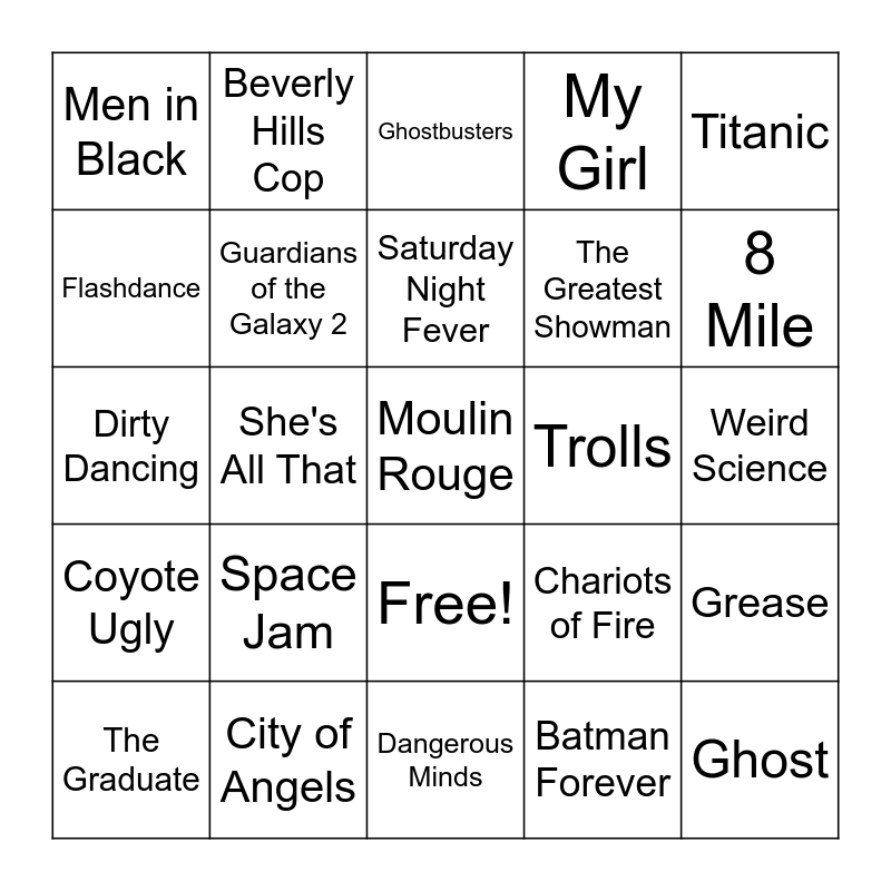 This bingo card has 26 words: Free!, Batman Forever, Saturday Night Fever, City of Angels, Titanic, Men in Black, Flashdance, Beverly Hills Cop, Weird Science, Chariots of Fire, The Greatest Showman, Dirty Dancing, Grease, The Graduate, She's All That, Lion King, My Girl, Coyote Ugly, Ghostbusters, Moulin Rouge, 8 Mile, Dangerous Minds, Trolls, Space Jam, Guardians of the Galaxy 2 and Ghost.