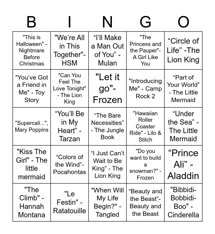 This bingo card has 42 words: “Two Worlds”- Tarzan, "Let it go"- Frozen, “Heigh-Ho” -Snow White and the Seven Dwarfs, “Colors of the Wind”- Pocahontas, “Beauty and the Beast”- Beauty and the Beast, “Prince Ali” -Aladdin, “The Bare Necessities” - The Jungle Book, “Hakuna Matata” -The Lion King, “I’ll Make a Man Out of You” - Mulan, “I Just Can’t Wait to Be King” - The Lion King, “Under the Sea” -The Little Mermaid, “Part of Your World” - The Little Mermaid, “You’ll Be in My Heart” -Tarzan, “Circle of Life” -The Lion King, "An Unusual Prince" - Sleeping beauty, "Do you want to build a snowman?" - Frozen, “A Whole New World,” Aladdin, "Supercali...", Mary Poppins, "Breaking Free"- HSM, "We’re All in This Together"- HSM, "You’ve Got a Friend in Me" - Toy Story, "This Is Me"- Camp Rock, "Bibbidi-Bobbidi-Boo" - Cinderella, "This is Halloween" - Nightmare Before Christmas, "The Best of Both Worlds" - Hannah Montana, "Who Will I Be" - Camp Rock, "Introducing Me" - Camp Rock 2, "Un poco loco" - Coco, "Following the Leader" - Peter Pan, "You Can Fly!" - Peter Pan, "The unbirthday song" - Alice in Wonderland, "Kiss The Girl" - The little mermaid, "Can You Feel The Love Tonight" - The Lion King, "When Will My Life Begin?" -Tangled, "Friend Like Me" - Aladdin, "The Climb" - Hannah Montana, "Le Festin" - Ratatouille, "Hawaiian Roller Coaster Ride" - Lilo & Stitch, "All star" - Shrek, "Remember Me" - Coco, "The Princess and the Pauper"- A Girl Like You and "Cruella De Vil" - 101 Dalmatians.