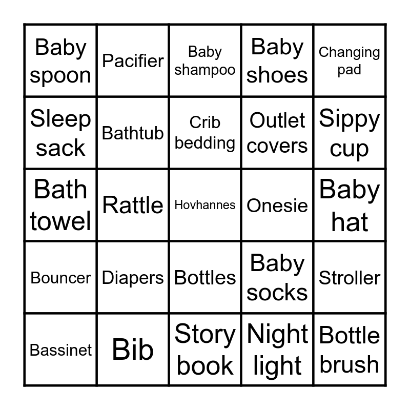 This bingo card has a free space and 39 words: Safety gate, High chair, Diaper pail, Bathtub, Bassinet, Bottles, Crib bedding, Bottle warmer, Changing pad, Bouncer, Rattle, Baby shoes, Bottle brush, Baby hat, Onesie, Diapers, Baby monitor, Baby spoon, Baby boy, Baby socks, Sleep sack, Story book, Outlet covers, Sippy cup, Formula, Crib, Bath toy, Feeding pillow, Car seat, Pacifier, Rubber duck, Stuffie, Baby shampoo, Bib, Night light, Teeter, Stroller, Bath towel and Rocking chair.