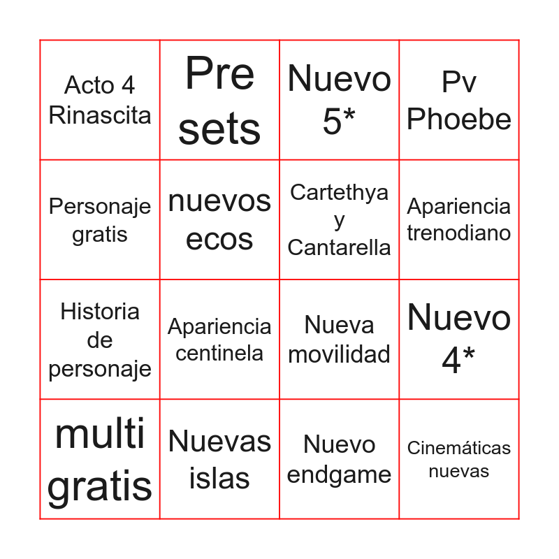This bingo card has 16 words: Nuevas islas, Nuevo 4*, Nuevo 5*, Acto 4 Rinascita, Historia de personaje, Pre sets, Nueva movilidad, Nuevo endgame, Personaje gratis, nuevos ecos, multi gratis, Pv Phoebe, Apariencia centinela, Apariencia trenodiano, Cartethya y Cantarella and Cinemáticas nuevas.