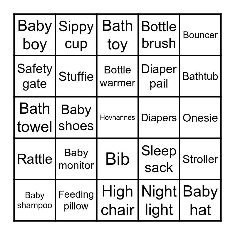This bingo card has a free space and 39 words: Car seat, Pacifier, Rubber duck, Stuffie, Baby shampoo, Bib, Bottle warmer, Changing pad, Bouncer, Rattle, Baby shoes, Bottle brush, Baby hat, Onesie, Diapers, Baby monitor, Baby spoon, Baby boy, Baby socks, Sleep sack, Safety gate, High chair, Diaper pail, Bathtub, Bassinet, Bottles, Crib bedding, Story book, Outlet covers, Sippy cup, Formula, Crib, Bath toy, Feeding pillow, Night light, Teeter, Stroller, Bath towel and Rocking chai.