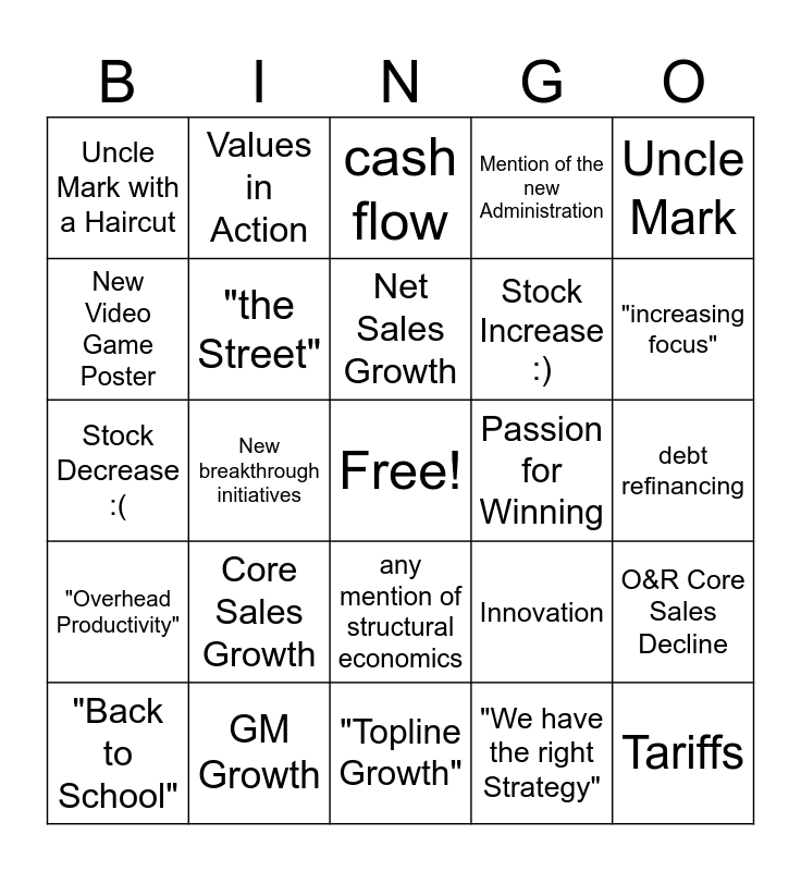 This bingo card has a free space and 24 words: Core Sales Growth, GM Growth, Net Sales Growth, "Back to School", Uncle Mark, Uncle Mark with a Haircut, New Video Game Poster, Values in Action, Passion for Winning, any mention of structural economics, Stock Increase :), Stock Decrease :(, Innovation, O&R Core Sales Decline, "the Street", "We have the right Strategy", debt refinancing, cash flow, "increasing focus", New breakthrough initiatives, Tariffs, "Overhead Productivity", Mention of the new Administration and "Topline Growth".