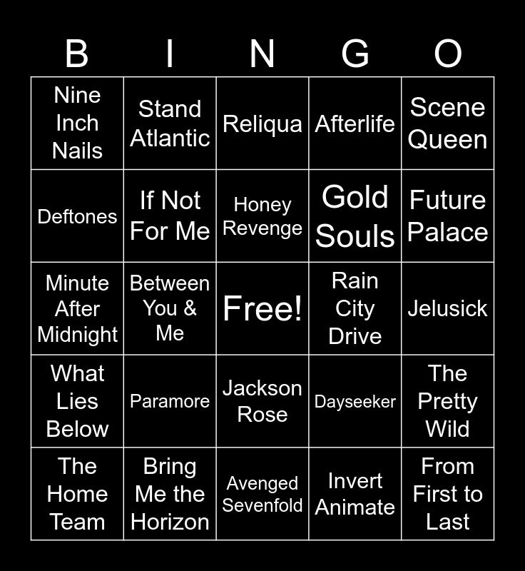 This bingo card has a free space and 24 words: Paramore, Bring Me the Horizon, Honey Revenge, The Home Team, Scene Queen, Nine Inch Nails, Deftones, Stand Atlantic, Rain City Drive, Jackson Rose, Gold Souls, Minute After Midnight, Dayseeker, The Pretty Wild, If Not For Me, Invert Animate, Jelusick, Reliqua, Future Palace, Between You & Me, From First to Last, What Lies Below, Afterlife and Avenged Sevenfold.