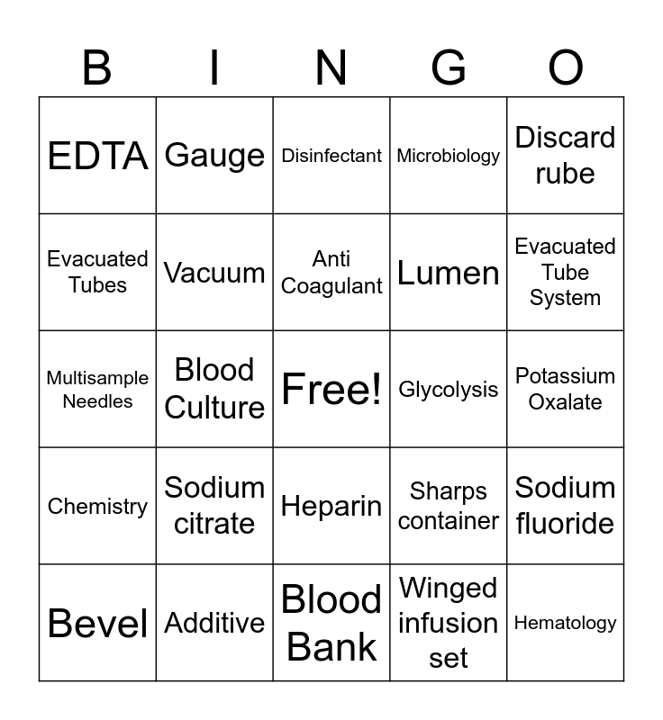 This bingo card has a free space and 24 words: Sodium citrate, Additive, Anti Coagulant, Bevel, Discard rube, EDTA, Evacuated Tubes, Gauge, Glycolysis, Heparin, Lumen, Multisample Needles, Sharps container, Sodium fluoride, Vacuum, Winged infusion set, Potassium Oxalate, Disinfectant, Evacuated Tube System, Blood Culture, Hematology, Chemistry, Microbiology and Blood Bank.