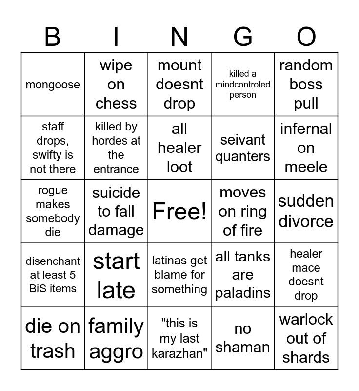 This bingo card has a free space and 24 words: start late, family aggro, all healer loot, die on trash, random boss pull, mongoose, staff drops, swifty is not there, wipe on chess, moves on ring of fire, latinas get blame for something, seivant quanters, rogue makes somebody die, all tanks are paladins, healer mace doesnt drop, killed by hordes at the entrance, no shaman, sudden divorce, mount doesnt drop, infernal on meele, suicide to fall damage, warlock out of shards, disenchant at least 5 BiS items, killed a mindcontroled person and "this is my last karazhan".