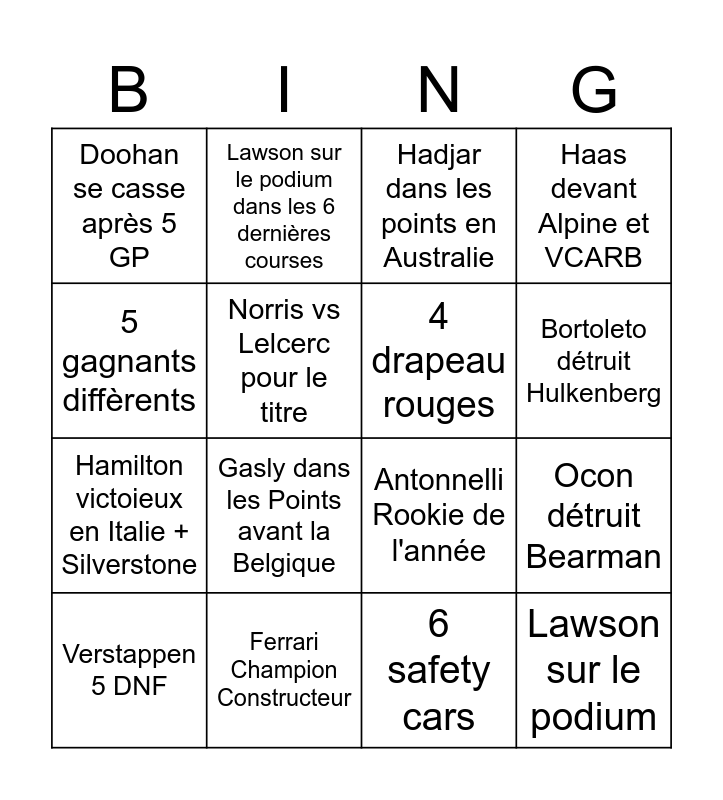 This bingo card has 16 words: Ferrari Champion Constructeur, Ocon détruit Bearman, Hadjar dans les points en Australie, Doohan se casse après 5 GP, Hamilton victoieux en Italie + Silverstone, Lawson sur le podium dans les 6 dernières courses, Antonnelli Rookie de l'année, 6 safety cars, 5 gagnants diffèrents, Norris vs Lelcerc pour le titre, Verstappen 5 DNF, Haas devant Alpine et VCARB, Gasly dans les Points avant la Belgique, Bortoleto détruit Hulkenberg, 4 drapeau rouges and Lawson sur le podium.