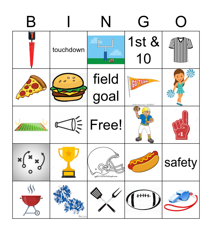 This bingo card has 24 images, a free space and 5 words: 1st & 10, touchdown, safety, field goal and extra point.