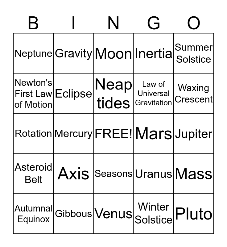 This bingo card has a free space and 33 words: Moon, Sun, Mercury, Earth, Asteroid Belt, Eclipse, Summer Solstice, Autumnal Equinox, Gravity, Weight, Neap tides, Moon, Saturn, Craters, Mars, Waxing Crescent, Gibbous, Rotation, Axis, Uranus, Seasons, Revolution, Neptune, Jupiter, Venus, Pluto, Inertia, Law of Universal Gravitation, Newton's First Law of Motion, Mass, Vernal Equinox, Winter Solstice and Orbit.