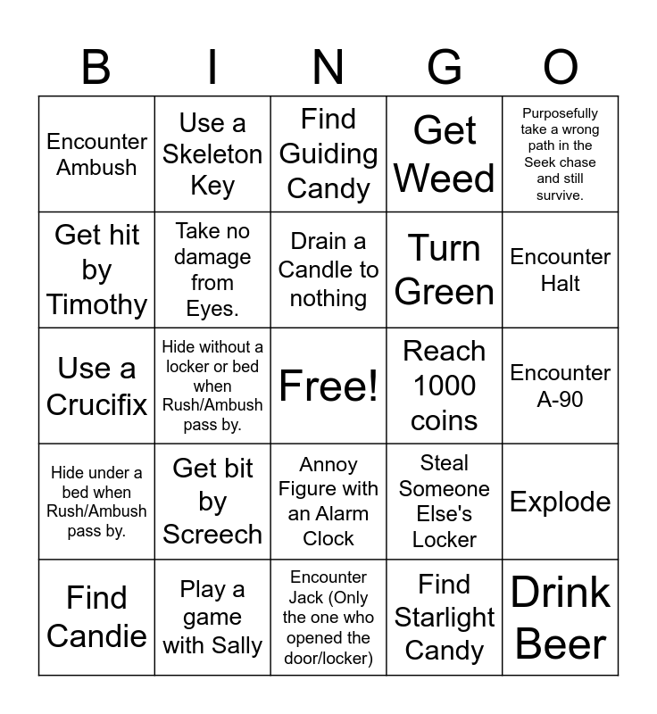 This bingo card has a free space and 24 words: Get bit by Screech, Play a game with Sally, Drain a Candle to nothing, Find Candie, Purposefully take a wrong path in the Seek chase and still survive., Encounter Ambush, Get hit by Timothy, Use a Skeleton Key, Reach 1000 coins, Annoy Figure with an Alarm Clock, Turn Green, Use a Crucifix, Steal Someone Else's Locker, Explode, Take no damage from Eyes., Find Starlight Candy, Encounter A-90, Find Guiding Candy, Encounter Halt, Hide without a locker or bed when Rush/Ambush pass by., Drink Beer, Hide under a bed when Rush/Ambush pass by., Get Weed and Encounter Jack (Only the one who opened the door/locker).