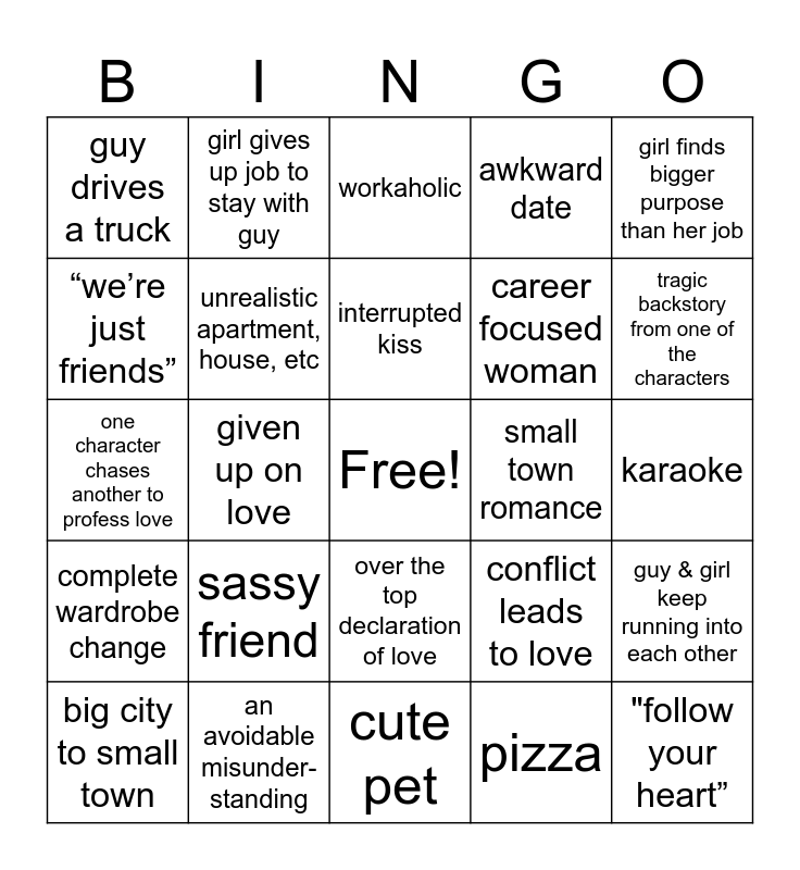This bingo card has a free space and 24 words: sassy friend, an avoidable misunder-standing, interrupted kiss, big city to small town, girl finds bigger purpose than her job, guy drives a truck, “we’re just friends”, girl gives up job to stay with guy, small town romance, over the top declaration of love, career focused woman, one character chases another to profess love, conflict leads to love, guy & girl keep running into each other, unrealistic apartment, house, etc, pizza, karaoke, workaholic, tragic backstory from one of the characters, given up on love, "follow your heart”, complete wardrobe change, awkward date and cute pet.