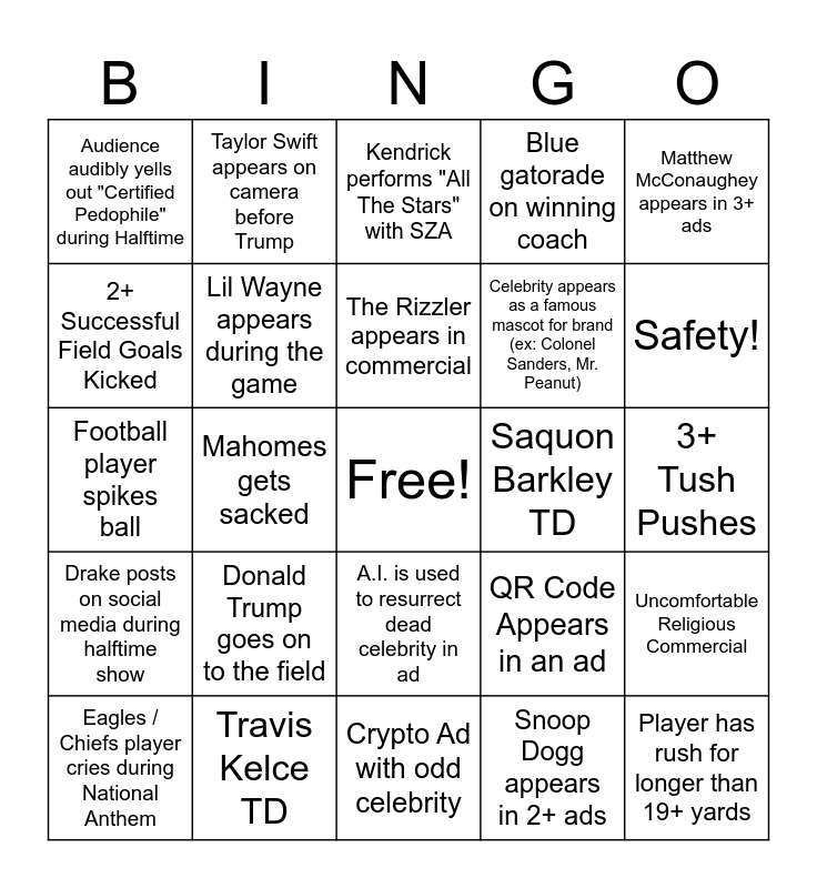 This bingo card has a free space and 24 words: Donald Trump goes on to the field, Travis Kelce TD, The Rizzler appears in commercial, Eagles / Chiefs player cries during National Anthem, Matthew McConaughey appears in 3+ ads, Audience audibly yells out "Certified Pedophile" during Halftime, 2+ Successful Field Goals Kicked, Taylor Swift appears on camera before Trump, Saquon Barkley TD, A.I. is used to resurrect dead celebrity in ad, Celebrity appears as a famous mascot for brand (ex: Colonel Sanders, Mr. Peanut), Football player spikes ball, QR Code Appears in an ad, Uncomfortable Religious Commercial, Lil Wayne appears during the game, Snoop Dogg appears in 2+ ads, 3+ Tush Pushes, Kendrick performs "All The Stars" with SZA, Safety!, Mahomes gets sacked, Player has rush for longer than 19+ yards, Drake posts on social media during halftime show, Blue gatorade on winning coach and Crypto Ad with odd celebrity.