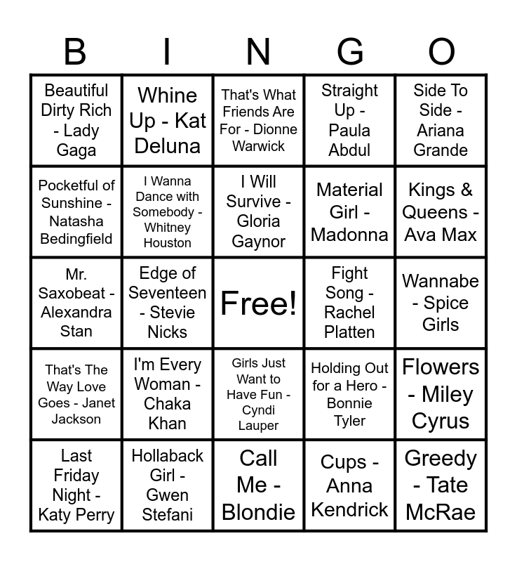 This bingo card has a free space and 100 words: Sk8er Boi - Avril Lavigne, Ironic - Alanis Morissette, Wannabe - Spice Girls, The Sign - Ace of Base, Stars Are Blind - Paris Hilton, Toxic - Britney Spears, Woman in Love - Barbra Streisand, So What - P!nk, Gypsy - Shakira, I Love Rock 'N Roll - Joan Jett, Fergalicious -Fergie, Bette Davis Eyes - Kim Carnes, Back To Black - Amy Winehouse, Hollaback Girl - Gwen Stefani, Girl on Fire - Alicia Keys, I Like It - Cardi B, Material Girl - Madonna, I Am Woman - Helen Reddy, If I Could Turn Back Time - Cher, Jolene - Dolly Parton, Single Ladies - Beyoncé, Unstoppable - Sia, All The Things She Said - t.A.T.u., Levitating - Dua Lipa, I'm Coming Out - Diana Ross, Fight Song - Rachel Platten, Side To Side - Ariana Grande, Holding Out for a Hero - Bonnie Tyler, Obsessed - Mariah Carey, Starships - Nicki Minaj, Edge of Seventeen - Stevie Nicks, Beautiful Dirty Rich - Lady Gaga, Closer - Tegan and Sara, You Belong With Me - Taylor Swift, Cups - Anna Kendrick, I Will Survive - Gloria Gaynor, Flowers - Miley Cyrus, Wuthering Heights - Kate Bush, Walk Like an Egyptian - The Bangles, He Wasn't Man Enough - Toni Braxton, These Boots Are Made For Walking - Nancy Sinatra, Get Ur Freak On - Missy Elliott, Mr. Saxobeat - Alexandra Stan, Right Time of the Night - Jennifer Warnes, Kings & Queens - Ava Max, That's What Friends Are For - Dionne Warwick, Black Widow - Iggy Azalea, Cupid - FIFTY FIFTY, All I Wanna Do - Sheryl Crow, Call Me - Blondie, A Thousand Miles - Vanessa Carlton, good 4 u - Olivia Rodrigo, Respect - Aretha Franklin, Can't Get You out of My Head - Kylie Minogue, I Want That Man - Debbie Harry, What's Love Got to Do With It - Tina Turner, Cry Baby - Janis Joplin, Candyman - Christina Aguilera, You Gotta Be - Des'ree, Straight Up - Paula Abdul, Hit Me With Your Best Shot - Pat Benatar, Whatever Will Be Will Be - Doris Day, Man! I Feel Like A Woman! - Shania Twain, Tom's Diner - DNA, Emotions - Brenda Lee, Because You Loved Me - Céline Dion, Scars To Your Beautiful - Alessia Cara, Rolling in the Deep - Adele, Smooth Operator - Sade, The Locomotion - Little Eva, | Wanna Love You Forever - Jessica Simpson, I'm Every Woman - Chaka Khan, Arms - Christina Perri, No Scrubs - TLC, Big Yellow Taxi - Joni Mitchell, Good Luck Babe! - Chappell Roan, Friday - Rebecca Black, Pocketful of Sunshine - Natasha Bedingfield, Say My Name - Destiny's Child, It's Raining Men - The Weather Girls, Fast Car - Tracy Chapman, Greedy - Tate McRae, April In Paris - Billie Holiday, Girls Just Want to Have Fun - Cyndi Lauper, This Kiss - Faith Hill, Whine Up - Kat Deluna, I Put A Spell On You - Nina Simone, Milkshake - Kelis, Commander - Kelly Rowland, That's The Way Love Goes - Janet Jackson, Since U Been Gone - Kelly Clarkson, Maneater - Nelly Furtado, Only Girl - Rihanna, Last Friday Night - Katy Perry, I Wanna Dance with Somebody - Whitney Houston, Bad Girls - Donna Summer, Lose Myself - Ms. Lauryn Hill, When I Grow Up - The Pussycat Dolls, bad guy - Billie Eilish and 1 2 Step - Ciara.