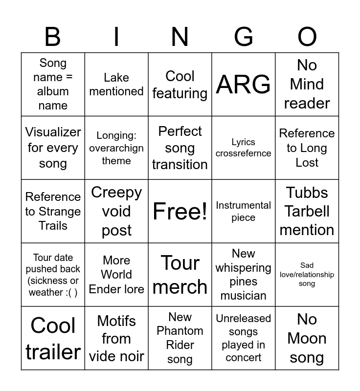 This bingo card has a free space and 24 words: More World Ender lore, Motifs from vide noir, Perfect song transition, Cool trailer, No Mind reader, Song name = album name, Visualizer for every song, Lake mentioned, Instrumental piece, Tour merch, Lyrics crossrefernce, Reference to Strange Trails, New whispering pines musician, Sad love/relationship song, Longing: overarchign theme, Unreleased songs played in concert, Tubbs Tarbell mention, Cool featuring, Reference to Long Lost, Creepy void post, No Moon song, Tour date pushed back (sickness or weather :( ), ARG and New Phantom Rider song.