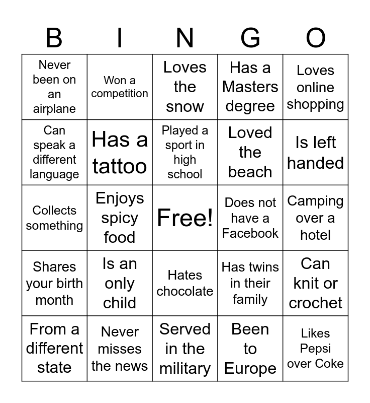 This bingo card has a free space and 24 words: Is an only child, Never misses the news, Played a sport in high school, From a different state, Loves online shopping, Never been on an airplane, Can speak a different language, Won a competition, Does not have a Facebook, Hates chocolate, Loved the beach, Collects something, Has twins in their family, Can knit or crochet, Has a tattoo, Been to Europe, Camping over a hotel, Loves the snow, Is left handed, Enjoys spicy food, Likes Pepsi over Coke, Shares your birth month, Has a Masters degree and Served in the military.