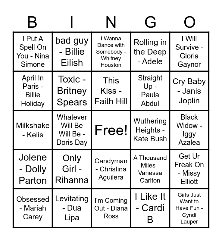 This bingo card has a free space and 100 words: Wannabe - Spice Girls, Bad Girls - Donna Summer, Black Widow - Iggy Azalea, Cupid - FIFTY FIFTY, Can't Get You out of My Head - Kylie Minogue, No Scrubs - TLC, All The Things She Said - t.A.T.u., When I Grow Up - The Pussycat Dolls, Last Friday Night - Katy Perry, Girl on Fire - Alicia Keys, Since U Been Gone - Kelly Clarkson, Woman in Love - Barbra Streisand, Right Time of the Night - Jennifer Warnes, Levitating - Dua Lipa, Sk8er Boi - Avril Lavigne, Scars To Your Beautiful - Alessia Cara, Straight Up - Paula Abdul, So What - P!nk, Single Ladies - Beyoncé, I Love Rock 'N Roll - Joan Jett, 1 2 Step - Ciara, Call Me - Blondie, I Am Woman - Helen Reddy, Hollaback Girl - Gwen Stefani, Material Girl - Madonna, Wuthering Heights - Kate Bush, I Will Survive - Gloria Gaynor, A Thousand Miles - Vanessa Carlton, I Want That Man - Debbie Harry, You Gotta Be - Des'ree, Whatever Will Be Will Be - Doris Day, I Put A Spell On You - Nina Simone, Fergalicious -Fergie, Side To Side - Ariana Grande, I Like It - Cardi B, This Kiss - Faith Hill, Get Ur Freak On - Missy Elliott, Gypsy - Shakira, Because You Loved Me - Céline Dion, Fast Car - Tracy Chapman, That's What Friends Are For - Dionne Warwick, Cups - Anna Kendrick, Milkshake - Kelis, Fight Song - Rachel Platten, Cry Baby - Janis Joplin, I Wanna Dance with Somebody - Whitney Houston, | Wanna Love You Forever - Jessica Simpson, Back To Black - Amy Winehouse, Whine Up - Kat Deluna, I'm Coming Out - Diana Ross, Unstoppable - Sia, Flowers - Miley Cyrus, Walk Like an Egyptian - The Bangles, All I Wanna Do - Sheryl Crow, Big Yellow Taxi - Joni Mitchell, You Belong With Me - Taylor Swift, Edge of Seventeen - Stevie Nicks, The Sign - Ace of Base, If I Could Turn Back Time - Cher, Rolling in the Deep - Adele, Starships - Nicki Minaj, I'm Every Woman - Chaka Khan, Tom's Diner - DNA, Stars Are Blind - Paris Hilton, Closer - Tegan and Sara, He Wasn't Man Enough - Toni Braxton, Respect - Aretha Franklin, Pocketful of Sunshine - Natasha Bedingfield, Holding Out for a Hero - Bonnie Tyler, What's Love Got to Do With It - Tina Turner, Arms - Christina Perri, Only Girl - Rihanna, Kings & Queens - Ava Max, Beautiful Dirty Rich - Lady Gaga, Friday - Rebecca Black, Smooth Operator - Sade, Maneater - Nelly Furtado, April In Paris - Billie Holiday, Man! I Feel Like A Woman! - Shania Twain, That's The Way Love Goes - Janet Jackson, Hit Me With Your Best Shot - Pat Benatar, Girls Just Want to Have Fun - Cyndi Lauper, The Locomotion - Little Eva, Candyman - Christina Aguilera, Lose Myself - Ms. Lauryn Hill, bad guy - Billie Eilish, Say My Name - Destiny's Child, Emotions - Brenda Lee, Greedy - Tate McRae, Jolene - Dolly Parton, It's Raining Men - The Weather Girls, good 4 u - Olivia Rodrigo, Ironic - Alanis Morissette, Obsessed - Mariah Carey, Toxic - Britney Spears, Commander - Kelly Rowland, These Boots Are Made For Walking - Nancy Sinatra, Mr. Saxobeat - Alexandra Stan, Bette Davis Eyes - Kim Carnes and Good Luck Babe! - Chappell Roan.