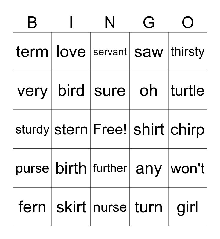 This bingo card has a free space and 29 words: fern, perch, stern, serf, term, servant, bird, birth, shirt, skirt, chirp, girl, nurse, turn, turtle, blur, further, purse, thirsty, sturdy, any, many, oh, very, saw, love, won't, sure and because.