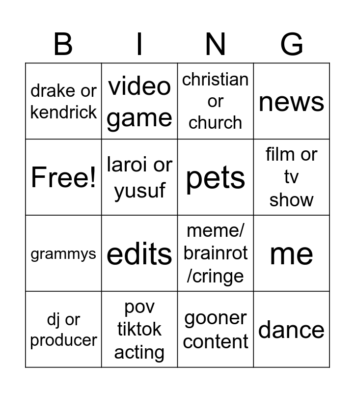 This bingo card has 16 words: pov tiktok acting, me, christian or church, drake or kendrick, grammys, video game, meme/ brainrot /cringe, gooner content, Free!, laroi or yusuf, dj or producer, news, edits, film or tv show, pets and dance.