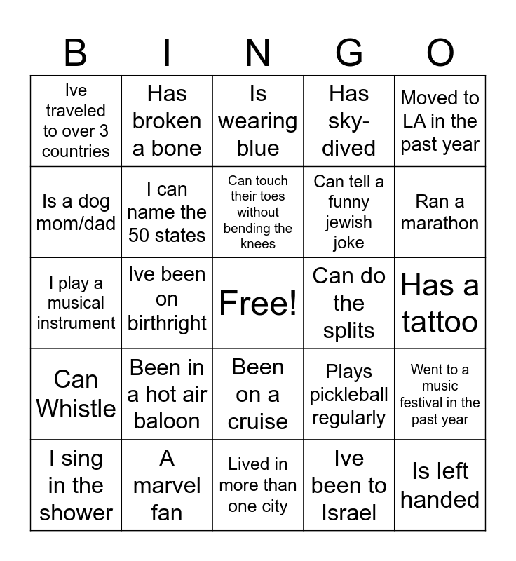 This bingo card has a free space and 29 words: I sing in the shower, This is my first time at Tzabarim, Ive been on birthright, I can do a cartwheel, Ive traveled to over 3 countries, Is wearing blue, I can name the 50 states, Been in a hot air baloon, Can do the splits, A marvel fan, Has a tattoo, Is left handed, Lived in more than one city, Ive been to Israel, Ran a marathon, Has ridden a horse, Been on a cruise, Can Whistle, Moved to LA in the past year, I play a musical instrument, Plays pickleball regularly, Can Juggle, Can tell a funny jewish joke, Is a dog mom/dad, Has sky-dived, Has broken a bone, Went to a music festival in the past year, Can touch their toes without bending the knees and Speaks Hebrew.