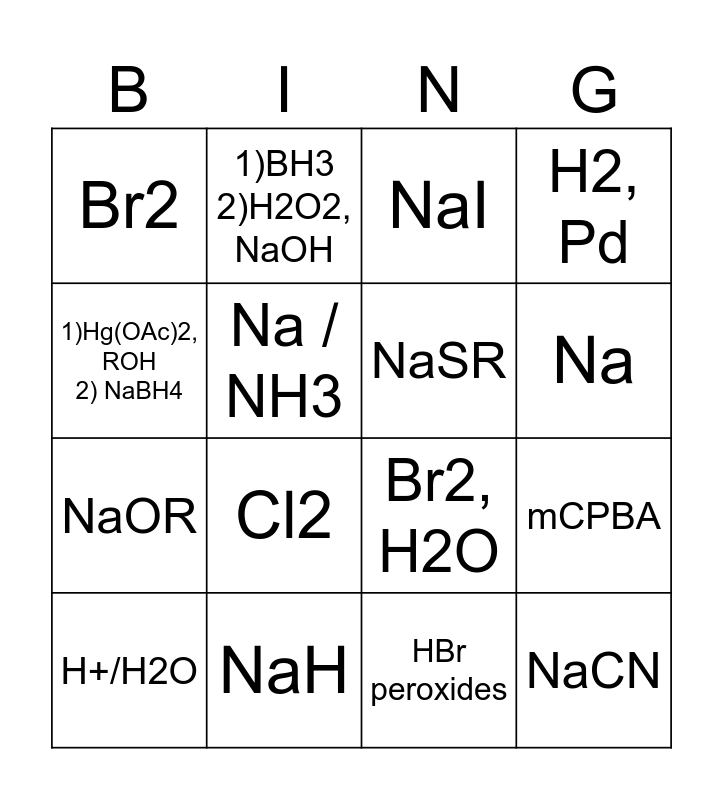 This bingo card has 28 words: Free!, NaH, NaOR, KOtBu, Na / NH3, NaI, 1)BH3 2)H2O2, NaOH, NaCN, NaH, HBr, Br2, H2O, H2, Pd, RSH, NaNH2, Cl2, LDA, H2, Lindlar, NaSR, Na, ROH, H+, Br2, H2O, H2SO4, HgSO4, H+/H2O, mCPBA, HBr peroxides, TsCl, py, 1)Hg(OAc)2, ROH 2) NaBH4 and NaOH/H2O.