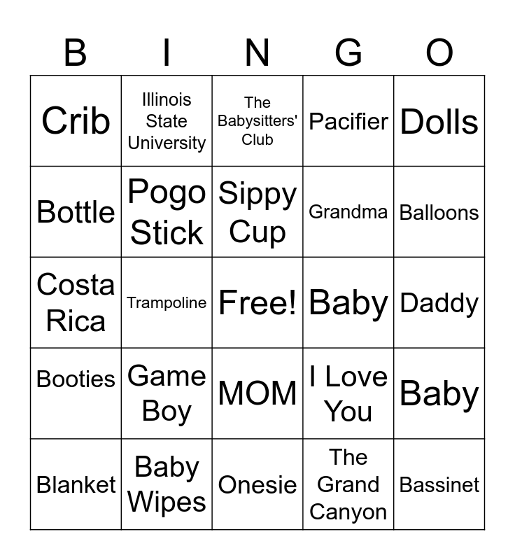 This bingo card has a free space and 54 words: Car Seat, Booties, Stroller, Diapers, MOM, Baby Food, Pacifier, Blanket, Bottle, Tacos, Crib, Stuffed Animal, Baby Wipes, Blanket, Wash Clothes, Onesie, Bassinet, Grandma, Grandpa, Daddy, I Love You, Fairytale, Baby, Dolls, Cubs, Illinois State University, Las Vegas, Blueberry Muffins, Tacos, The Grand Canyon, Blocks, SI Kids, Junie B Jones, I Love You Forever, The Babysitters' Club, Fenway Park, Costa Rica, Baby, Pizza, Pogo Stick, Puzzles, Hula Hoop, Tricycle, Bicycle, Game Boy, Yellow Card, T-Ball, High Chair, Sippy Cup, Trampoline, Balloons, Bogie, Cries and Labor.