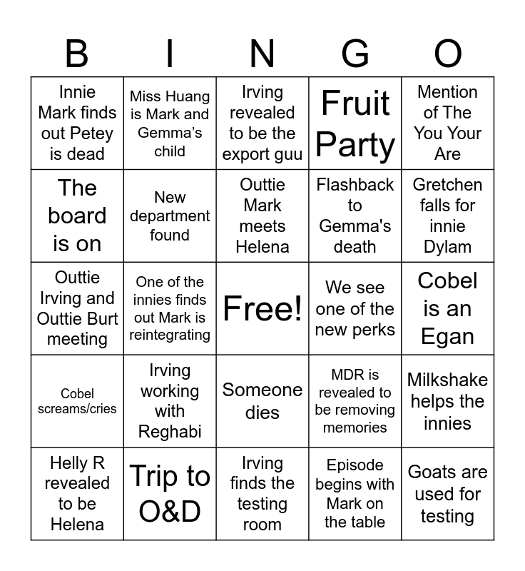 This bingo card has a free space and 24 words: Helly R revealed to be Helena, Irving working with Reghabi, Outtie Mark meets Helena, Episode begins with Mark on the table, Mention of The You Your Are, Innie Mark finds out Petey is dead, Miss Huang is Mark and Gemma’s child, Irving revealed to be the export guu, We see one of the new perks, Cobel is an Egan, Outtie Irving and Outtie Burt meeting, New department found, MDR is revealed to be removing memories, Milkshake helps the innies, The board is on, Trip to O&D, Irving finds the testing room, Fruit Party, Gretchen falls for innie Dylam, Cobel screams/cries, One of the innies finds out Mark is reintegrating, Someone dies, Flashback to Gemma's death and Goats are used for testing.