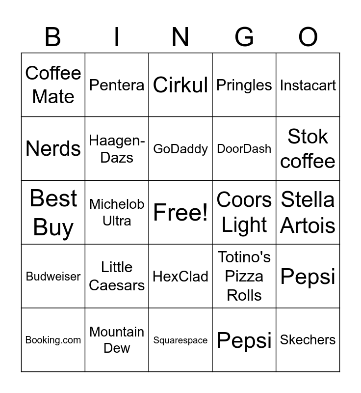 This bingo card has a free space and 39 words: Doritos, Hellman's, Dunkin, Haagen-Dazs, Booking.com, HexClad, GoDaddy, Bud Light, Instacart, Budweiser, Michelob Ultra, Pringles, Skechers, Stella Artois, Coors Light, Little Caesars, Uber Eats, Coffee Mate, Dove, Totino's Pizza Rolls, Nerds, Squarespace, DoorDash, Stok coffee, Ram, Nerd Wallet, Turbotax, Reese's, Taco Bell, Pentera, Ray Ban Meta Glasses, Homes.com, Cirkul, Mountain Dew, Pepsi, WeatherTech, Pepsi, Best Buy and Bosch.