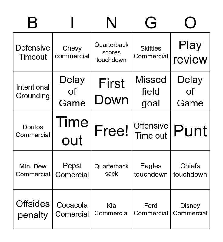This bingo card has a free space and 24 words: Pepsi Comercial, Cocacola Comercial, First Down, Offsides penalty, Play review, Defensive Timeout, Intentional Grounding, Chevy commercial, Offensive Time out, Quarterback sack, Missed field goal, Doritos Commercial, Eagles touchdown, Chiefs touchdown, Delay of Game, Ford Commercial, Punt, Quarterback scores touchdown, Delay of Game, Time out, Disney Commercial, Mtn. Dew Commercial, Skittles Commercial and Kia Commercial.