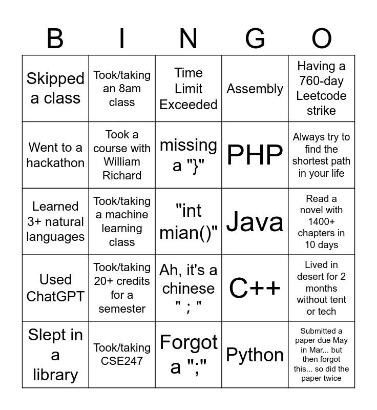 This bingo card has 25 words: Used ChatGPT, Took/taking CSE247, "int mian()", Python, Having a 760-day Leetcode strike, Skipped a class, Took/taking an 8am class, Time Limit Exceeded, Java, Lived in desert for 2 months without tent or tech, Went to a hackathon, Took a course with William Richard, Forgot a ";", C++, Always try to find the shortest path in your life, Slept in a library, Took/taking a machine learning class, missing a "}", PHP, Read a novel with 1400+ chapters in 10 days, Learned 3+ natural languages, Took/taking 20+ credits for a semester, Ah, it's a chinese ";", Assembly and Submitted a paper due May in Mar... but then forgot this... so did the paper twice.