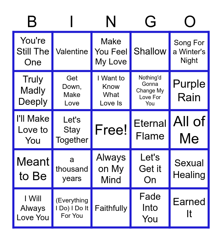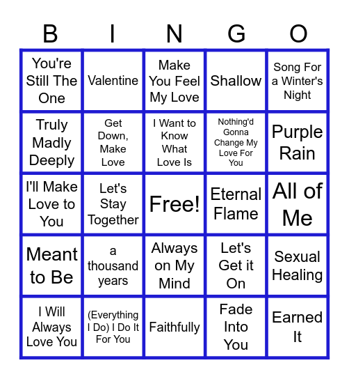 This bingo card has a free space and 24 words: a thousand years, (Everything I Do) I Do It For You, I Want to Know What Love Is, I Will Always Love You, Song For a Winter's Night, You're Still The One, Truly Madly Deeply, Valentine, Eternal Flame, Always on My Mind, Nothing'd Gonna Change My Love For You, I'll Make Love to You, Let's Get it On, Sexual Healing, Get Down, Make Love, Fade Into You, All of Me, Make You Feel My Love, Purple Rain, Let's Stay Together, Earned It, Meant to Be, Shallow and Faithfully.