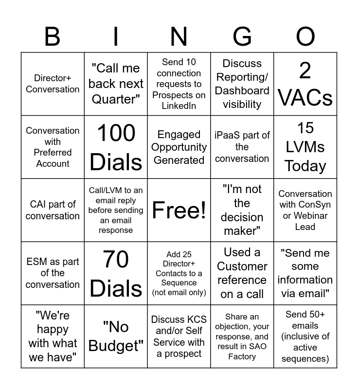 This bingo card has a free space and 24 words: 70 Dials, "No Budget", Engaged Opportunity Generated, "We're happy with what we have", 2 VACs, Director+ Conversation, Conversation with Preferred Account, "Call me back next Quarter", "I'm not the decision maker", Add 25 Director+ Contacts to a Sequence (not email only), iPaaS part of the conversation, CAI part of conversation, Used a Customer reference on a call, "Send me some information via email", 100 Dials, Share an objection, your response, and result in SAO Factory, Conversation with ConSyn or Webinar Lead, Send 10 connection requests to Prospects on LinkedIn, 15 LVMs Today, Call/LVM to an email reply before sending an email response, Send 50+ emails (inclusive of active sequences), ESM as part of the conversation, Discuss Reporting/ Dashboard visibility and Discuss KCS and/or Self Service with a prospect.
