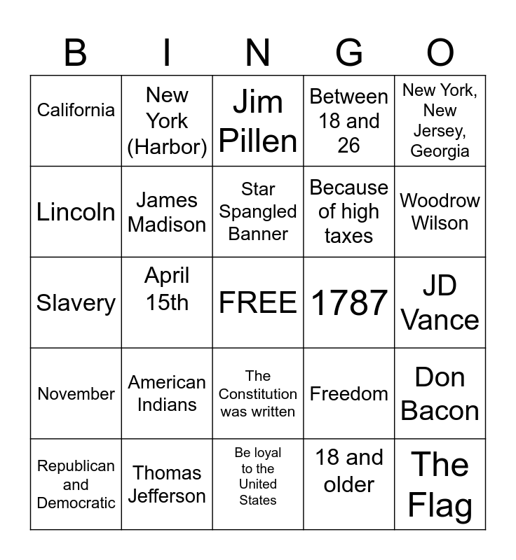 This bingo card has a free space and 24 words: American Indians, Thomas Jefferson, Star Spangled Banner, Republican and Democratic, New York, New Jersey, Georgia, California, Lincoln, New York (Harbor), 1787, The Constitution was written, Because of high taxes, Slavery, Freedom, Don Bacon, James Madison, 18 and older, JD Vance, Jim Pillen, Woodrow Wilson, April 15th, The Flag, November, Between 18 and 26 and Be loyal to the United States.