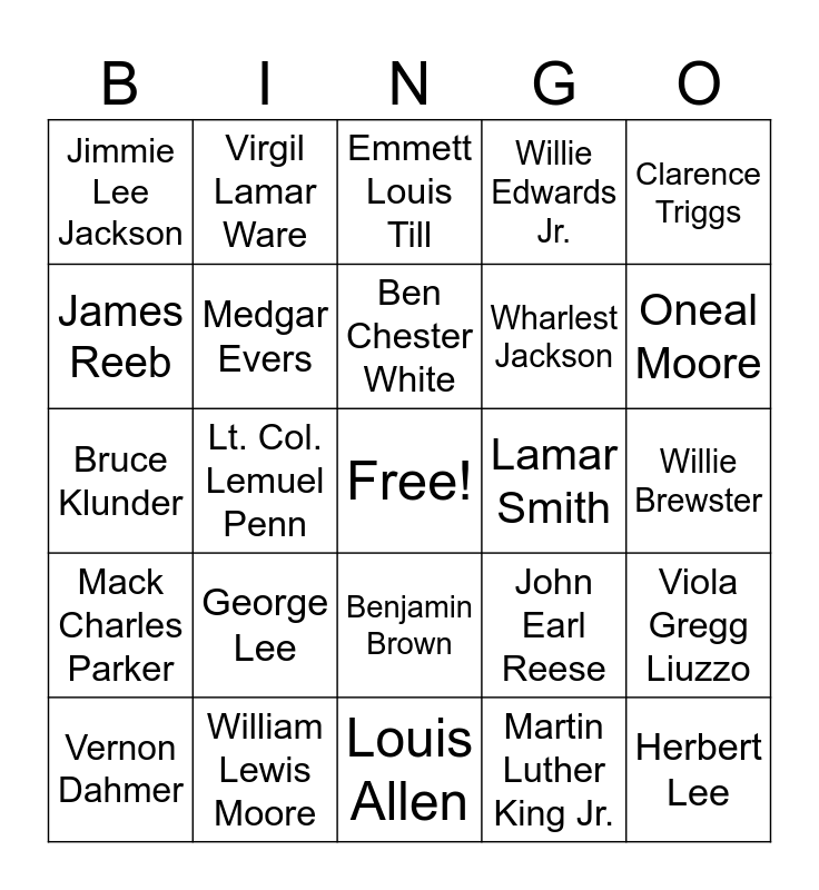 This bingo card has a free space and 24 words: George Lee, William Lewis Moore, Ben Chester White, Vernon Dahmer, Clarence Triggs, Jimmie Lee Jackson, James Reeb, Virgil Lamar Ware, Lamar Smith, Benjamin Brown, Wharlest Jackson, Bruce Klunder, John Earl Reese, Viola Gregg Liuzzo, Medgar Evers, Martin Luther King Jr., Willie Brewster, Emmett Louis Till, Oneal Moore, Lt. Col. Lemuel Penn, Herbert Lee, Mack Charles Parker, Willie Edwards Jr. and Louis Allen.