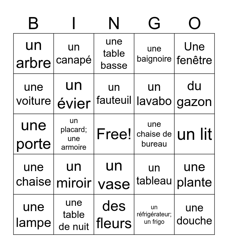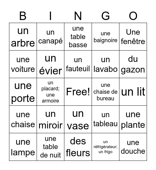This bingo card has a free space and 32 words: un réfrigérateur; un frigo, un micro-ondes, un placard; une armoire, une cuisinière; un four, une chaise, un évier, Une fenêtre, une plante, un canapé, un tapis, un fauteuil, une table basse, une étagère, un bureau, une chaise de bureau, un ordinateur, une lampe, une porte, un vase, un miroir, un tableau, une commode, un lit, une table de nuit, une douche, une baignoire, un lavabo, une voiture, un arbre, des fleurs, un banc and du gazon.