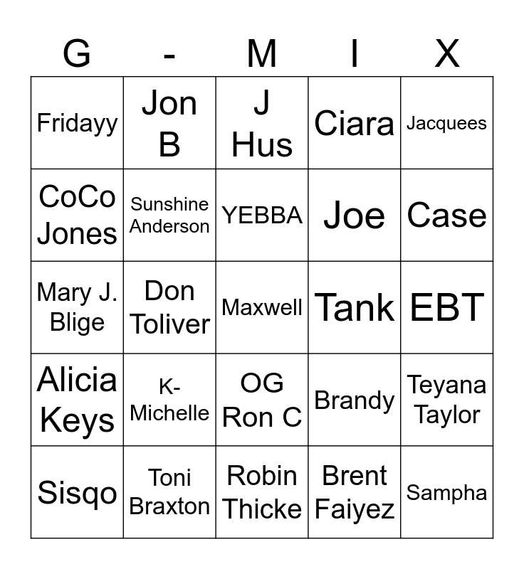 This bingo card has 65 words: Jill Scott, Omarion, Kali Uchis, Teyana Taylor, Ryan Trey, Jazmine Sullivan, Jon B, Mariah Carey, YEBBA, Anthony Hamilton, OG Ron C, Kelly Rowland, EBT, Jacquees, Muni Long, CoCo Jones, Don Toliver, Fridayy, October London, Joe, K-Michelle, Alicia Keys, Ciara, Chris Brown, Bruno Mars, Johnny Gill, Gerald Levert, John Legend, Maxwell, Keith Sweat, Sisqo, Jodeci, Montell Jordan, Lloyd., Brandy, Toni Braxton, Fantasia, Mary J. Blige, Brent Faiyez, Janet Jackson, Sunshine Anderson, Tevin Campbell, Tank, Silk, Monica, Tyese, Case, Mya, Sampha, Summer Walker, Coco Jones, Victoria Monét, The Weeknd, Robin Thicke, Ella Mai, Miguel, Ari Lennox, J Hus, Robert Glasper, Tone Stith, Jorja Smith, Brent Faiyaz, Lola Brooke, SZA and Kenyon Dixon.