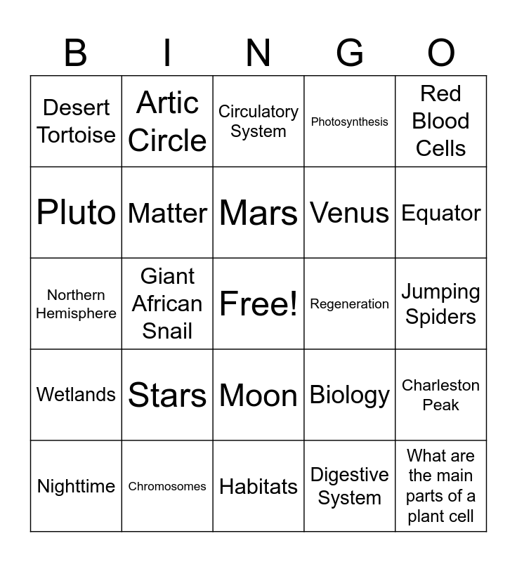 This bingo card has a free space and 44 words: What are the three states of matter, What are the main parts of a plant cell, Daytime, Nighttime, Solar System, Digestive System, Circulatory System, White Blood Cells, Red Blood Cells, Chromosomes, Photosynthesis, Regeneration, Moon, Stars, Food webs, Habitats, Water Cycle, Northern Hemisphere, Southern Hemisphere, Equator, Artic Circle, Coyote, Black Bear, Desert Tortoise, Scorpion, Jumping Spiders, Crickets, Biosphere, Biology, Wetlands, Burro, Charleston Peak, Red Rock, Asian Longhorn Beetle, Giant African Snail, Sun, Galaxy, Saturn, Mars, Pluto, Venus, Solar Eclipse, Matter and Periodic Table.