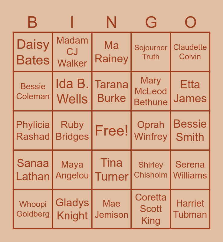 This bingo card has a free space and 50 words: Michelle Obama, Harriet Tubman, Rosa Parks, Mae Jemison, Maya Angelou, Angela Davis, Madam CJ Walker, Ella Baker, Bessie Coleman, Misty Copeland, Ida B. Wells, Sojourner Truth, Serena Williams, Shirley Chisholm, Fannie Lou Hamer, Katherine Johnson, Tarana Burke, Oprah Winfrey, Audre Lorde, Claudette Colvin, Ruby Bridges, Coretta Scott King, Daisy Bates, Mary McLeod Bethune, Aretha Franklin, Billie Holiday, Etta James, Whitney Houston, Ma Rainey, Tina Turner, Beyoncé, Lauryn Hill, Chaka Khan, Patti LaBelle, Gladys Knight, Janet Jackson, Diana Ross, Anita Baker, Nina Simone, Bessie Smith, Cicely Tyson, Viola Davis, Taraji P. Henson, Angela Bassett, Whoopi Goldberg, Phylicia Rashad, Josephine Baker, Alfre Woodard, Sanaa Lathan and Vivica A. Fox.