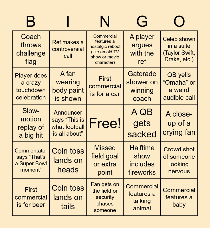 This bingo card has a free space and 24 words: Coin toss lands on heads, Coin toss lands on tails, First commercial is for a car, First commercial is for beer, Celeb shown in a suite (Taylor Swift, Drake, etc.), Coach throws challenge flag, Player does a crazy touchdown celebration, Ref makes a controversial call, A QB gets sacked, Missed field goal or extra point, Gatorade shower on winning coach, Slow-motion replay of a big hit, Halftime show includes fireworks, Crowd shot of someone looking nervous, A fan wearing body paint is shown, Commercial features a talking animal, A close-up of a crying fan, Commercial features a nostalgic reboot (like an old TV show or movie character), QB yells “Omaha” or a weird audible call, Announcer says “This is what football is all about”, Commercial features a baby, Commentator says “That’s a Super Bowl moment”, A player argues with the ref and Fan gets on the field or security chases someone.